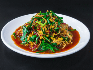 Ростки сои, дикий чеснок, свинина, красный перец стружка