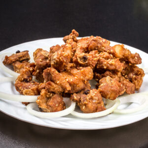 Свиные ребра во фритюре, в собственном маринаде, со свежим репчатым луком. 400 гр.