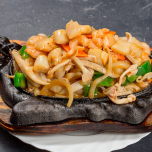 Гребешок, кальмар, креветка, морковь, лук, болгарский перец. кунжутное масло. 500гр.