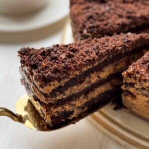 Изысканный торт из слоев нежного бисквита и творожного крема. Сверху торт украшен посыпкой из белого шоколада.