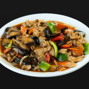 Свинина, грибы шиитаке, болгарский перец, морковь, соевый соус