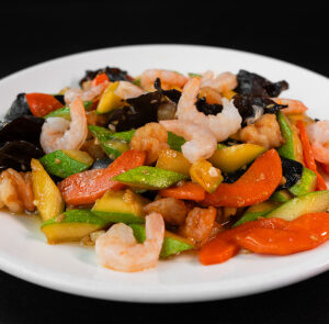 Цукини,древесные грибы, креветка,морковь,соевый соус.